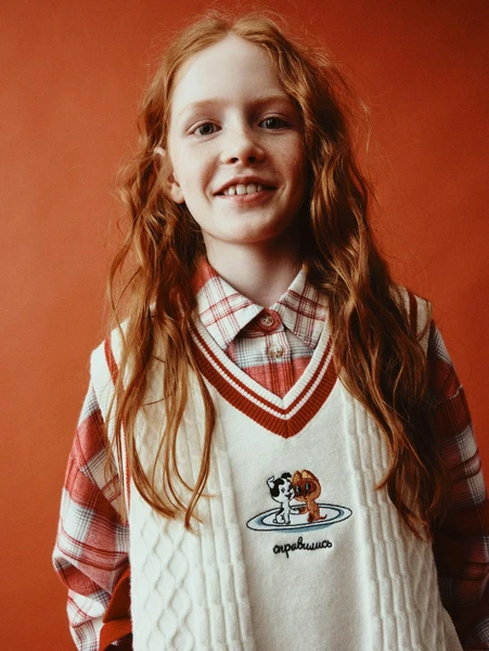Дизайн жилета продуман до мелочей: классический V-образный вырез и изящная узорчатая вязка гармонично сочетаются с эксклюзивной вышивкой, изображающей щенков из любимых мультфильмов «Союзмультфильм». Это не просто одежда, это — часть волшебного мира детства! 🐶