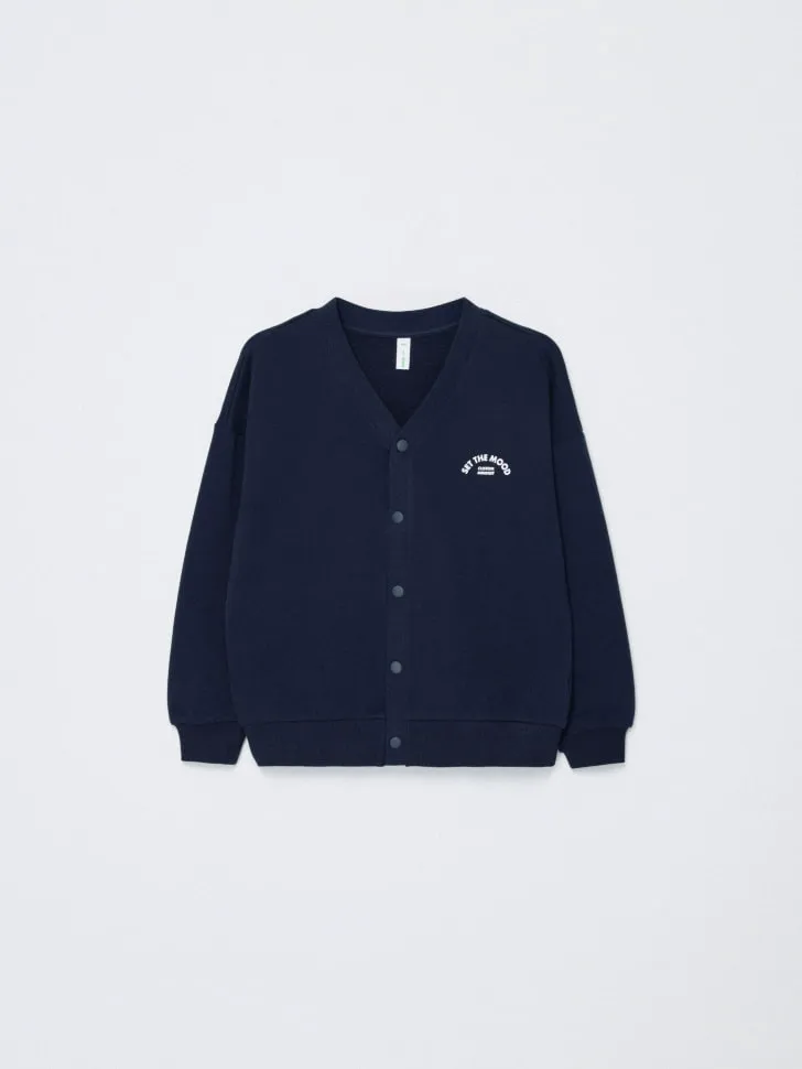 Дизайн кардигана дополнен стильной надписью 'SET THE MOOD' на груди, что придает ему современный и динамичный вид. Застежка на кнопки делает его очень практичным и удобным в использовании. Сочетайте его с джинсами, брюками или даже шортами для создания разнообразных и модных образов. Этот кардиган – это инвестиция в комфорт и уверенность вашего мальчика!