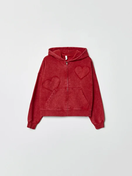Особое внимание привлекает оригинальная аппликация в виде сердечек, расположенная на груди, которая придает изделию неповторимый шарм и игривый вид. Насыщенный красный цвет толстовки с эффектом легкой потертости выглядит очень актуально и модно, легко вписываясь в различные образы. Толстовка оснащена удобной молнией по всей длине и практичным капюшоном, который защитит от ветра и непогоды. Продуманный состав ткани гарантирует долговечность и простоту в уходе, сохраняя яркость цвета и форму после многочисленных стирок. Выбирая эту толстовку SELA, вы дарите своей дочери не только модную вещь, но и чувство уверенности и комфорта. Она станет отличным дополнением к повседневным нарядам, позволяя создавать яркие и запоминающиеся луки. Откройте для себя мир стиля SELA!