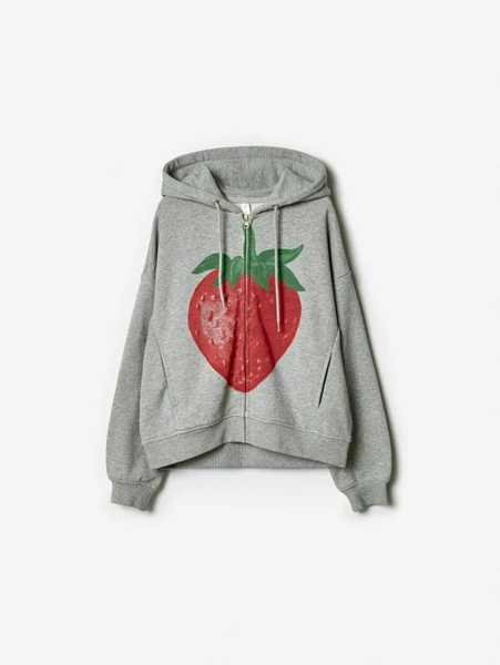 - Яркий дизайн: Выполнена в нежном сером цвете и украшена крупным, красочным принтом сочной клубники, который непременно поднимет настроение.