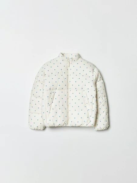 - ✨ Оригинальный дизайн: Молочная расцветка с милым голубым принтом в горошек делает эту куртку по-настоящему очаровательной и универсальной для различных образов.