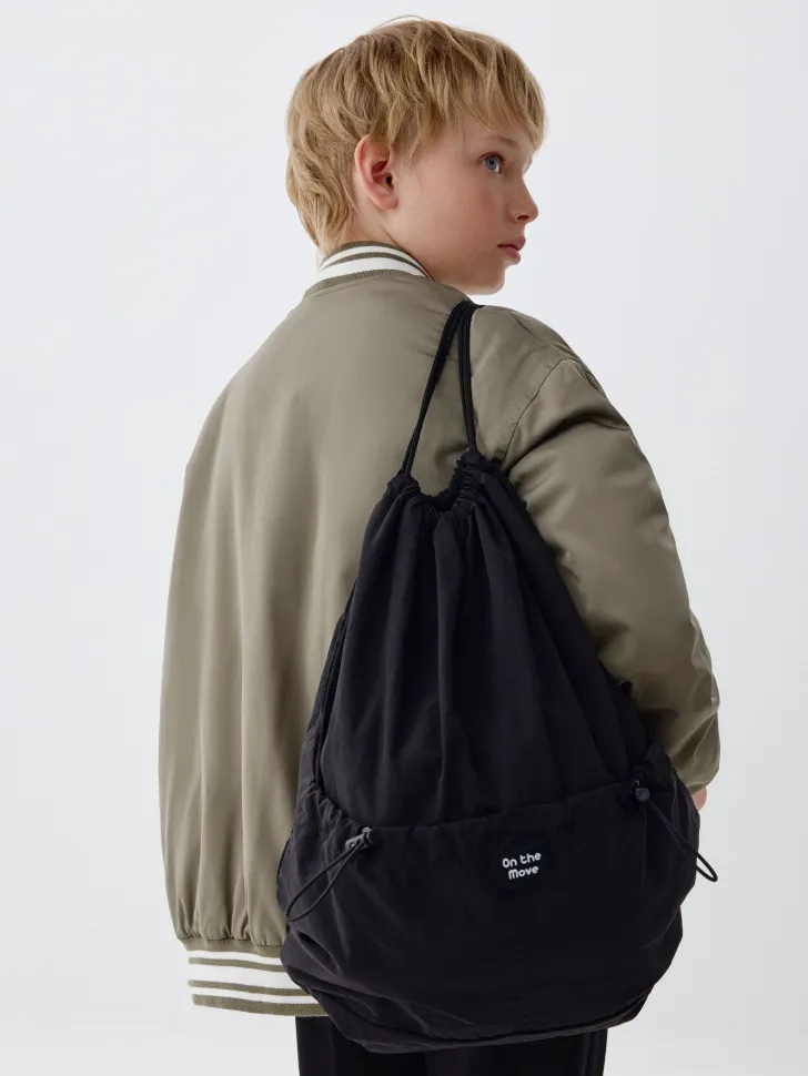 Представляем идеальную детскую сумку-мешок, которая станет незаменимым аксессуаром для вашего ребенка! Эта модель сочетает в себе практичность, стиль и долговечность, делая ее отличным выбором для школы, спортивных секций или повседневных прогулок. Сумка выполнена из прочного материала черного цвета, который легко чистится и долго сохраняет первоначальный вид. Удобный формат мешка с затягивающимся шнурком позволяет легко упаковывать и извлекать вещи, а также надежно хранить содержимое. Дизайн дополнен оригинальной нашивкой с надписью «On the move», придающей изделию индивидуальность и современный вид.