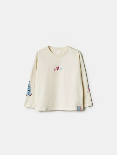 Дизайн лонгслива продуман до мелочей: нежный молочный цвет служит идеальным фоном для милых и ярких принтов. На груди расположены трогательные сердечки, а рукава украшают забавные изображения мишек, добавляя игривости и уникальности образу. Такой лонгслив отлично подойдет для: