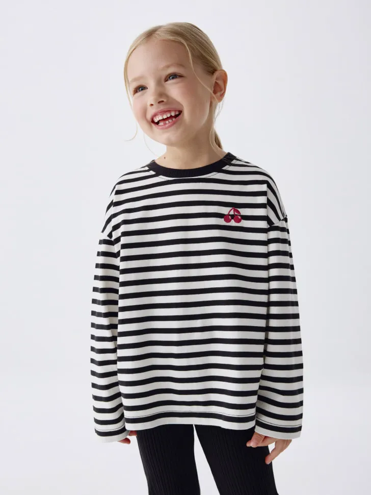 Универсальный дизайн с классической полоской делает этот лонгслив легко комбинируемым с различными элементами гардероба: от джинсов и леггинсов до юбок и шорт. Он станет незаменимой основой для создания как повседневных, так и более нарядных ансамблей. Отлично подходит для школы, прогулок, встреч с друзьями или уютных домашних вечеров. Продуманный крой гарантирует идеальную посадку, а высококачественные материалы обеспечивают долговечность изделия и сохранение яркости цвета после многократных стирок. Подарите вашей девочке комфорт и уверенность с нашим стильным лонгсливом!
