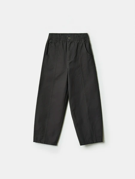 Созданные из 100% хлопка, эти брюки отличаются особой прочностью и приятной на ощупь текстурой ткани твил. Материал прекрасно держит форму, устойчив к износу и легко стирается, что особенно важно для детской одежды. Эластичная резинка на поясе обеспечивает идеальную посадку и не давит, позволяя ребенку свободно двигаться, будь то на прогулке, в школе или на отдыхе. Глубокий темно-серый цвет делает их универсальными для создания разнообразных повседневных образов. Отлично подходят для демисезона.
