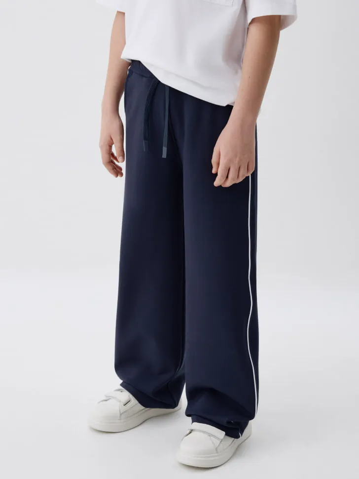 Благодаря своему свободному крою, эти брюки гарантируют максимальную свободу движений, не сковывая и не натирая кожу даже при интенсивных нагрузках. Это делает их идеальным выбором для игр на свежем воздухе, школьных занятий, спортивных секций или просто для комфортного отдыха дома. Стильные лампасы – контрастные белые полосы по бокам – не только добавляют модели современный спортивный шик, но и визуально вытягивают силуэт, делая образ более динамичным и модным.