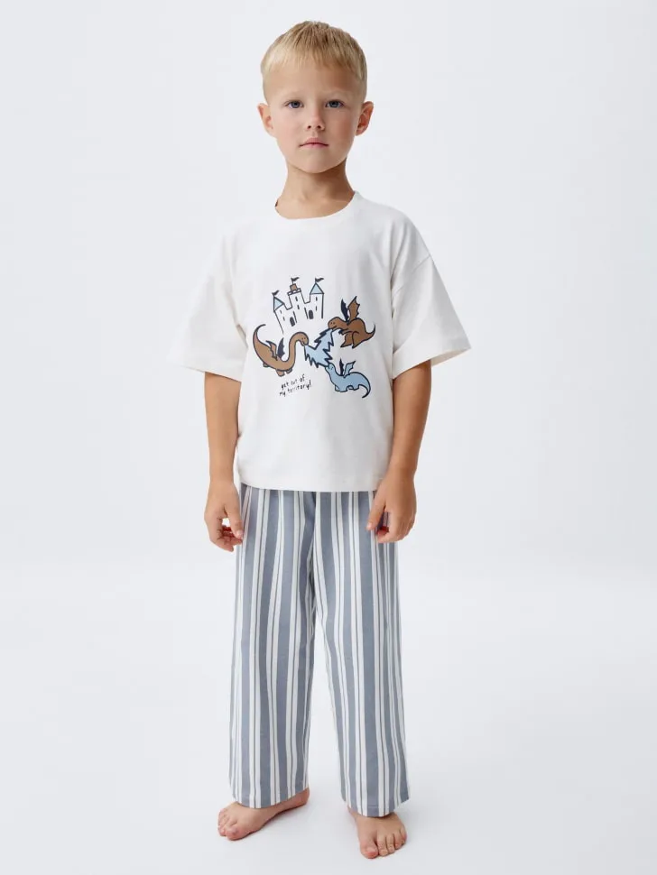 Представляем уютную пижаму для мальчиков, которая станет любимой одеждой для дома и сна! Этот стильный комплект из двух предметов разработан с заботой о комфорте вашего ребенка. Мягкая и приятная к телу футболка выполнена в нежном молочном цвете и украшена оригинальным принтом, изображающим сказочный замок и очаровательных драконов. Такой дизайн подарит юному мечтателю вдохновение для увлекательных снов и фантазийных игр.