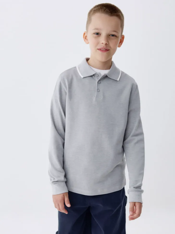 Классический дизайн с отложным воротником и элегантной белой окантовкой придает поло аккуратный и ухоженный вид. Длинные рукава делают эту модель идеальным выбором для прохладного времени года или в качестве школьной формы. Оно прекрасно сочетается как со строгими брюками, так и с повседневными джинсами, позволяя создавать множество стильных образов для школы, праздников или прогулок. Выбирайте качество и комфорт для вашего ребенка с этим превосходным поло!