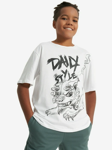 Белая футболка украшена оригинальным и запоминающимся принтом "DAILY STYLE" с изображением яркого мифического существа, который подчеркнет индивидуальность вашего ребенка и добавит изюминку в его повседневный или спортивный гардероб. Дизайн принта спроектирован так, чтобы вдохновлять на приключения и подчеркивать активный характер. Классический круглый вырез горловины и свободный покрой обеспечивают оптимальную посадку и полную свободу движений, не стесняя ребенка. Футболка легко сочетается с различной одеждой, что делает ее универсальной основой для создания множества модных образов. Demix — это выбор в пользу высокого качества, долговечности и современного стиля для ваших детей!