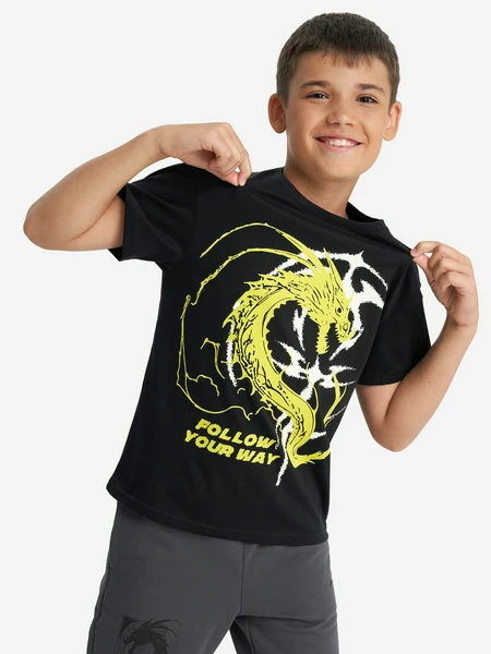Благодаря свободному покрою и классическому круглому вырезу горловины, футболка идеально подходит как для повседневной носки, так и для занятий спортом. Особое внимание привлекает яркий принт с драконом и мотивирующей надписью "FOLLOW YOUR WAY", добавляющей образу динамичности. Черный цвет делает футболку универсальной и легко сочетаемой с другими элементами гардероба. Произведена в Узбекистане, что подтверждает надежность и качество Demix. Это всесезонная модель, которая станет отличным дополнением к спортивному или повседневному образу вашего ребенка.