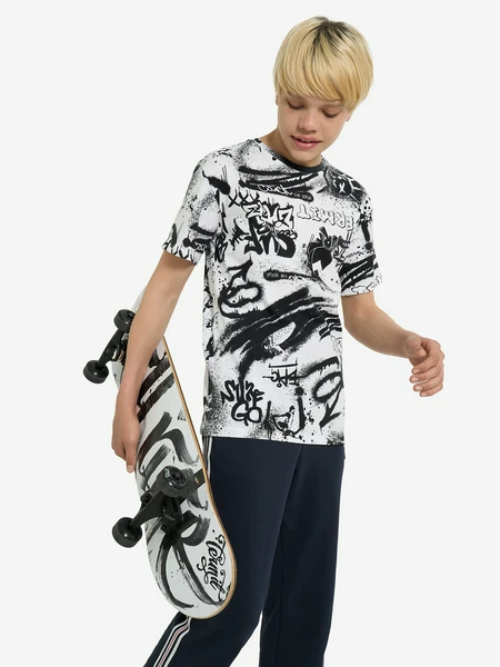 Представляем стильную и комфортную футболку Termit для мальчиков, которая идеально дополнит гардероб юного исследователя городских джунглей или пляжных волн! Эта модель с уникальным принтом в стиле граффити призвана подчеркнуть индивидуальность и любовь к активному образу жизни. Белый фон с выразительными черными надписями и штрихами создает динамичный и современный образ.