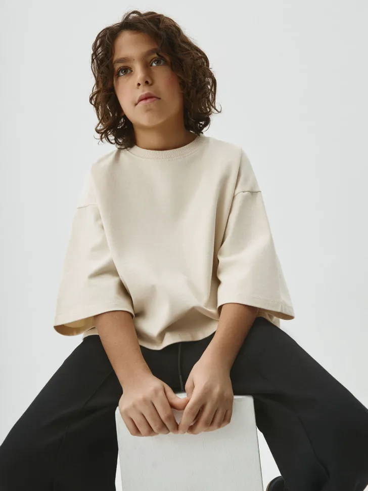 Благодаря свободному крою оверсайз, футболка отлично сидит на любой фигуре, не стесняя движений и не вызывая дискомфорта. Ее универсальный бежевый цвет легко комбинируется с шортами, джинсами или спортивными брюками, позволяя создавать множество интересных и практичных комплектов на каждый день. Это настоящий маст-хэв в гардеробе каждого мальчика, ценящего комфорт, практичность и современный стиль. Подарите вашему ребенку свободу и уверенность в каждом движении с нашей базовой футболкой оверсайз!