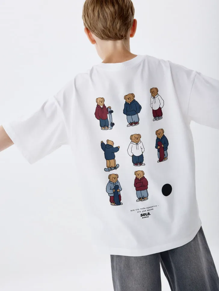 Добро пожаловать в мир стиля и комфорта с нашей детской футболкой оверсайз с принтом! Эта модель из коллекции SELA ARCHIVE создана для того, чтобы ваш ребенок чувствовал себя абсолютно свободно и уверенно в любой ситуации. Свободный крой оверсайз не только соответствует последним модным тенденциям, но и гарантирует неограниченную свободу движений, что особенно важно для активных детей. Оригинальный, привлекательный принт делает эту футболку ярким акцентом в любом образе, позволяя вашему ребенку выразить свою индивидуальность.