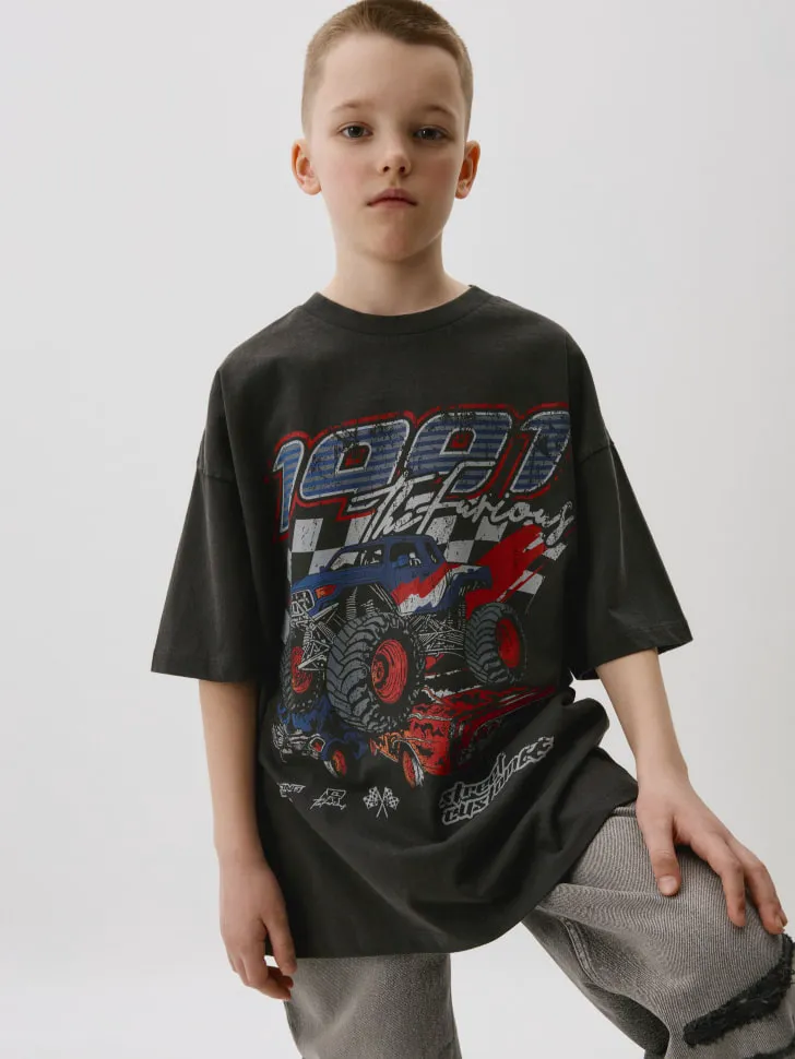 Представляем эксклюзивную детскую футболку оверсайз – идеальный выбор для юных ценителей стиля и комфорта! Эта уникальная модель создана специально для мальчиков, которые обожают приключения и яркие образы. На футболке красуется динамичный принт с изображением "Monster Truck" и стилизованной надписью "1997 The Furious", что делает ее по-настоящему запоминающейся и модной. Основной темно-серый цвет легко вписывается в любой гардероб и позволяет создавать множество стильных комбинаций с джинсами, шортами или спортивными брюками.
