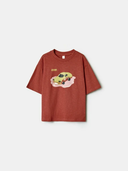 Футболки и топыОткройте для вашего ребенка мир стиля и комфорта с футболкой оверсайз SELA! Эта модель — идеальный выбор для мальчиков, которые ценят свободу движений и выразительный дизайн. Футболка выполнена в трендовом терракотовом цвете и украшена ярким, запоминающимся принтом в виде фантазийной машинки, создающей эффект плавления. Надпись 'Through barriers' вдохновляет на преодоление любых преград и символизирует дух приключений.