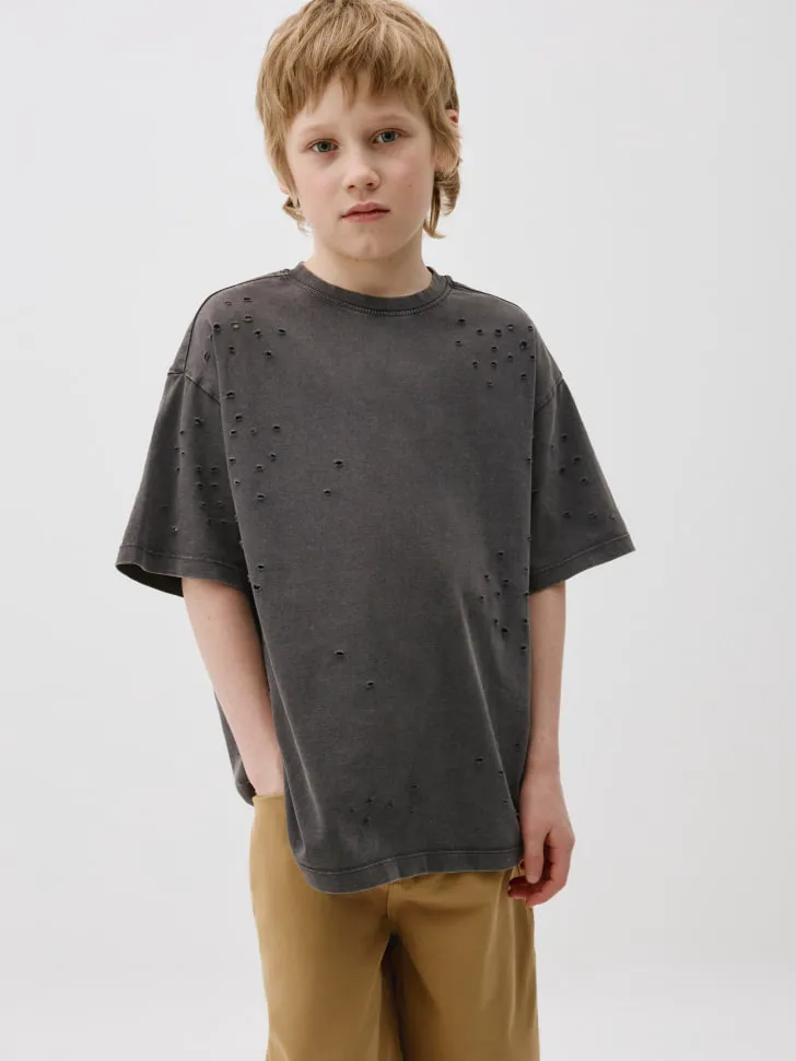 Футболка выполнена из высококачественного, приятного на ощупь материала, который устойчив к износу и легко переносит многочисленные стирки, сохраняя свой первоначальный вид. Характерные для стиля гранж элементы – потертости и небольшие декоративные отверстия – придают изделию ультрамодный и дерзкий вид, позволяя создать по-настоящему уникальные образы. Эта футболка легко комбинируется с различными элементами гардероба: от классических джинсов до спортивных брюк, что делает ее универсальным решением для любого случая. Подарите вашему мальчику не просто одежду, а возможность выразить свой характер через яркий и запоминающийся стиль!