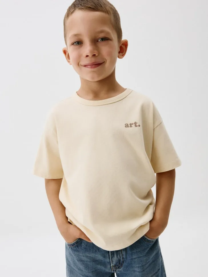 Представляем идеальную футболку для мальчиков, которая сочетает в себе стиль и исключительный комфорт. Эта модная бежевая футболка с элегантным принтом "art." станет незаменимым элементом гардероба вашего ребенка. Изготовленная из высококачественного, приятного к телу материала (предположительно, 100% хлопок), она обеспечивает максимальную воздухопроницаемость и мягкость, что критично для нежной детской кожи.