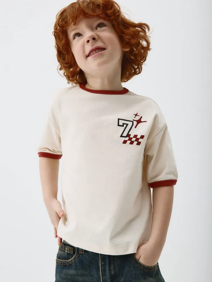 Особое внимание привлекает оригинальный принт с динамичной цифрой '7' и гоночными акцентами, который идеально подчеркнет активный характер вашего мальчика. Контрастная отделка горловины и рукавов добавляет модели современный и законченный вид. Футболка отлично сочетается с джинсами, шортами или спортивными брюками, делая ее универсальным выбором для детского гардероба. Идеально подходит для игр, прогулок и повседневного использования, обеспечивая долговечность и легкость в уходе. Подарите вашему ребенку не только стильную, но и очень практичную вещь!