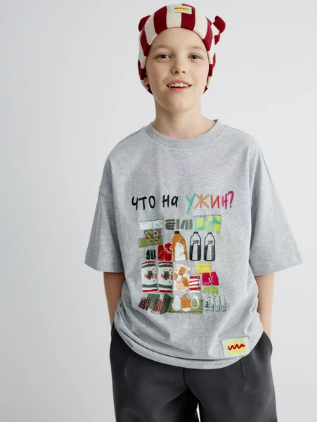 Особенность футболки – это оригинальный принт с вопросом «Что на ужин?» и изображением содержимого холодильника, который добавит яркости и индивидуальности образу вашего юного модника. Она легко сочетается с любыми низами – от джинсов до спортивных брюк, позволяя создавать разнообразные и стильные комбинации. Выбирайте качество и современный дизайн от SELA для вашего чемпиона!
