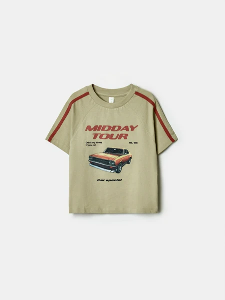 - Яркий принт: Винтажный автомобиль и надпись "MIDDAY TOUR" добавляют динамичности и индивидуальности образу.