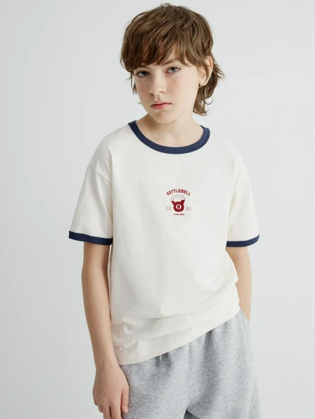 Особую изюминку модели придает оригинальный принт с надписью "KETTLEBELL" и изображением гири, выполненный в красных тонах. Он добавляет изделию динамичности и подчеркивает индивидуальность. Молочный цвет футболки гармонично сочетается с контрастной темно-синей окантовкой по вороту и рукавам, создавая завершенный и модный образ.