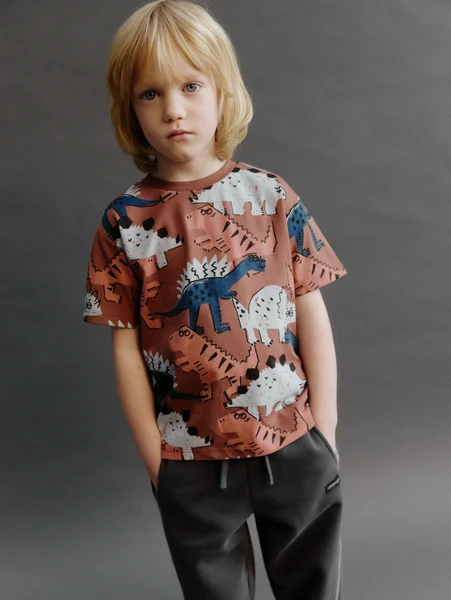 - Яркий дизайн: Принт с разнообразными динозаврами на терракотовом фоне привлечет внимание и станет любимым элементом гардероба. Цвета принта: синий, белый, черный.