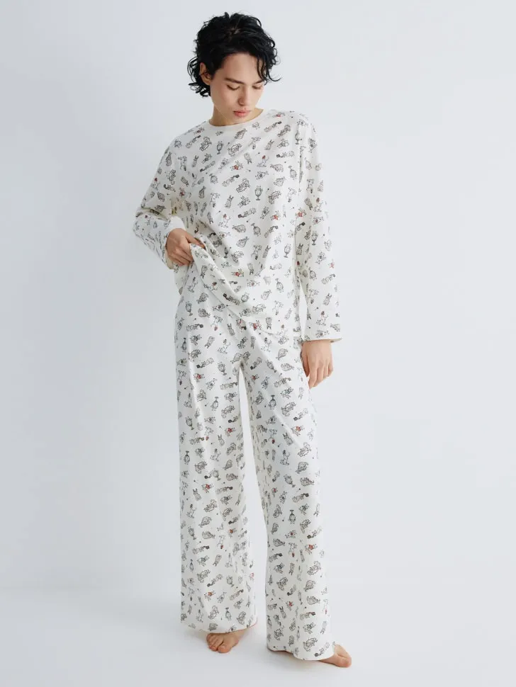 Каждая деталь этой пижамы продумана для вашего полного расслабления. Длинные брюки свободного кроя и лонгслив с длинными рукавами гарантируют комфорт в любое время года. Очаровательный принт добавляет изделию индивидуальности и игривости, делая его не просто одеждой для сна, но и стильным домашним костюмом. Идеально подходит для спокойных вечеров, утренних ритуалов или просто для того, чтобы чувствовать себя прекрасно и уверенно в кругу семьи. Подарите себе моменты истинного блаженства и уюта с этой уникальной пижамой.