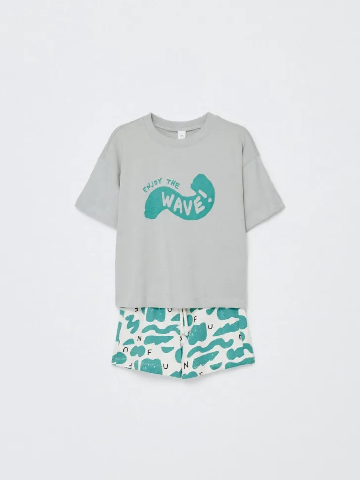 Представляем идеальный летний комплект для вашего мальчика! ☀️ Этот стильный набор из мягкой футболки и удобных шорт станет незаменимым в гардеробе юного модника. Выполненный из дышащих и приятных к телу материалов, он обеспечит максимальный комфорт даже в самые жаркие дни и позволит коже дышать. 🏖️ Идеальный выбор для активного отдыха!