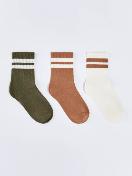 Носки и колготкиПредставляем эксклюзивный набор из 3 пар детских носков SELA, созданный специально для комфорта и стиля вашего ребенка! Эти носки идеально подходят для мальчиков, предлагая сочетание практичности и модного дизайна. В каждой упаковке вы найдете три пары носков уникальных расцветок: насыщенный хаки, теплый терракотовый и нежный молочный. Каждая пара дополнена классическими контрастными полосками на резинке, что придает им спортивный и современный вид.