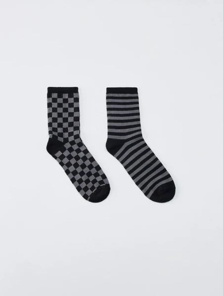 - Одна пара с модным и динамичным шахматным узором в черно-серых тонах. Этот дизайн добавит оригинальности в повседневный образ.