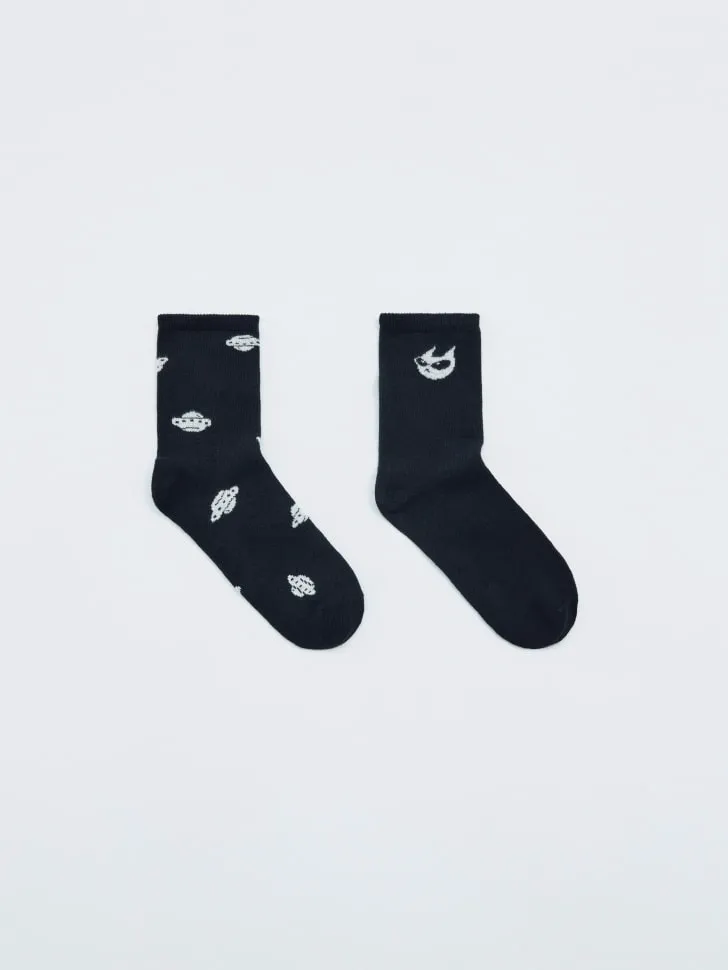 В наборе вы найдете две уникальные пары: одна с динамичным космическим принтом, изображающим НЛО и загадочные планеты, а другая — с оригинальным изображением забавного инопланетного существа, которое добавит игривости. 👽 Выполненные из высококачественных материалов, эти черные носки обеспечивают исключительный комфорт и долговечность. Они идеально сидят на ноге, не сползают и позволяют коже дышать, что особенно важно для активных мальчиков. Будь то школа, спортивные секции или веселые игры на улице, эти носки станут незаменимым элементом гардероба. 🎁 Сделайте практичный и стильный подарок, который точно придется по вкусу!