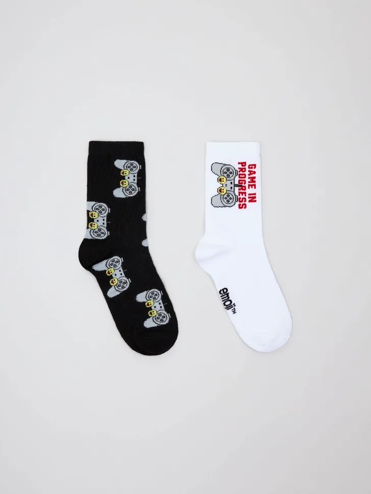 Представляем идеальный набор носков для юных геймеров! Этот стильный комплект из двух пар создан специально для мальчиков, которые обожают приключения и виртуальные миры. Первая пара – модные черные носки с яркими принтами игровых контроллеров, которые добавят индивидуальности любому образу. Вторая пара – классические белые, украшенные мотивирующей надписью "GAME IN PROGRESS" и тем же знаковым контроллером.