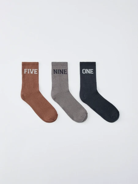 Набор включает носки в универсальной цветовой гамме: теплый коричневый, классический серый и глубокий темно-синий. Каждая пара дополнена оригинальной надписью "FIVE", "NINE" или "ONE", что придает им особый характер. Это позволяет легко сочетать их с различными нарядами и создавать интересные образы. Отличный выбор для школы, прогулок или домашнего отдыха!