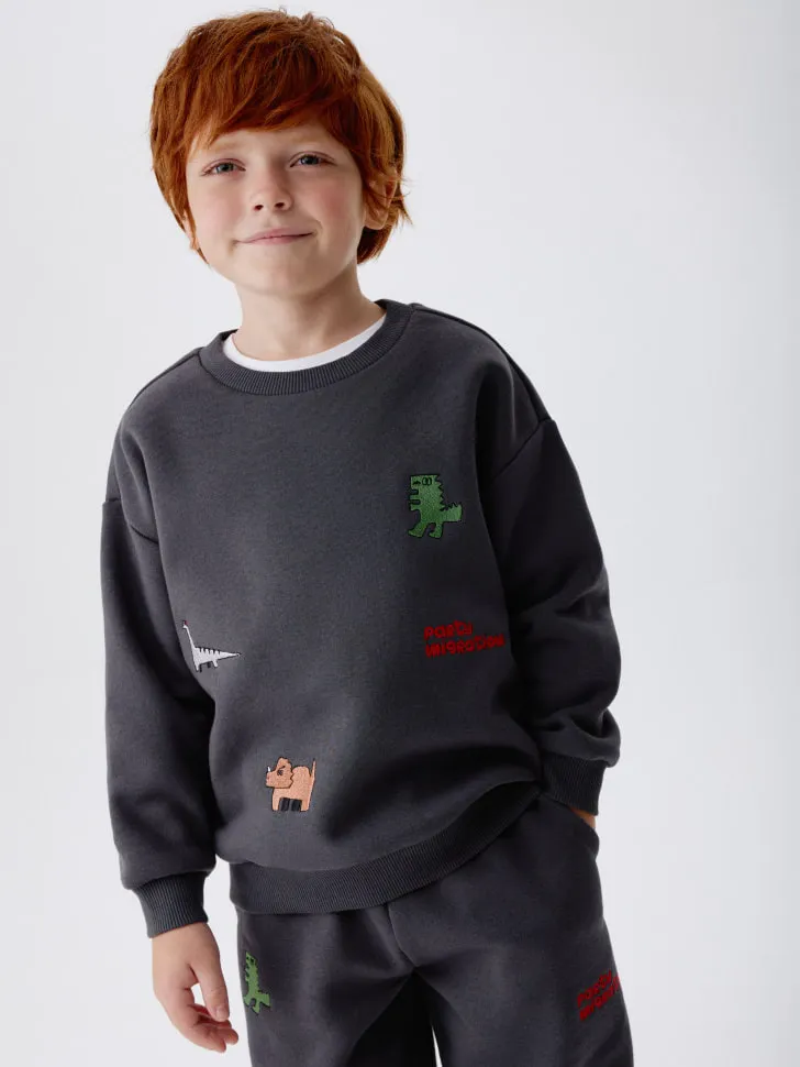 Представляем идеальный свитшот для вашего активного мальчишки! 🚀 Этот стильный темно-серый свитшот украшен забавными объемными аппликациями динозавров и других животных, которые обязательно понравятся юным исследователям. 🦕🦖