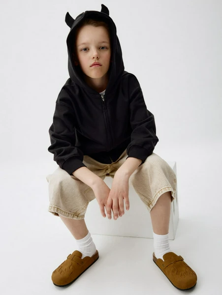 Модель выполнена из высококачественного мягкого материала, обеспечивающего максимальный уют и тепло в прохладную погоду. Благодаря практичному черному цвету, толстовка легко комбинируется с любой одеждой, будь то джинсы, спортивные брюки или шорты. Удобная молния по всей длине и функциональный капюшон с милыми рожками добавят изюминку в повседневный образ. Это не просто одежда, это способ выразить индивидуальность вашего ребёнка и подарить ему уверенность в себе.