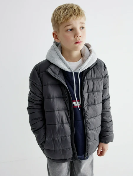 Куртка выполнена в универсальном темно-сером цвете, который легко вписывается в любой образ, от повседневного до школьного.
