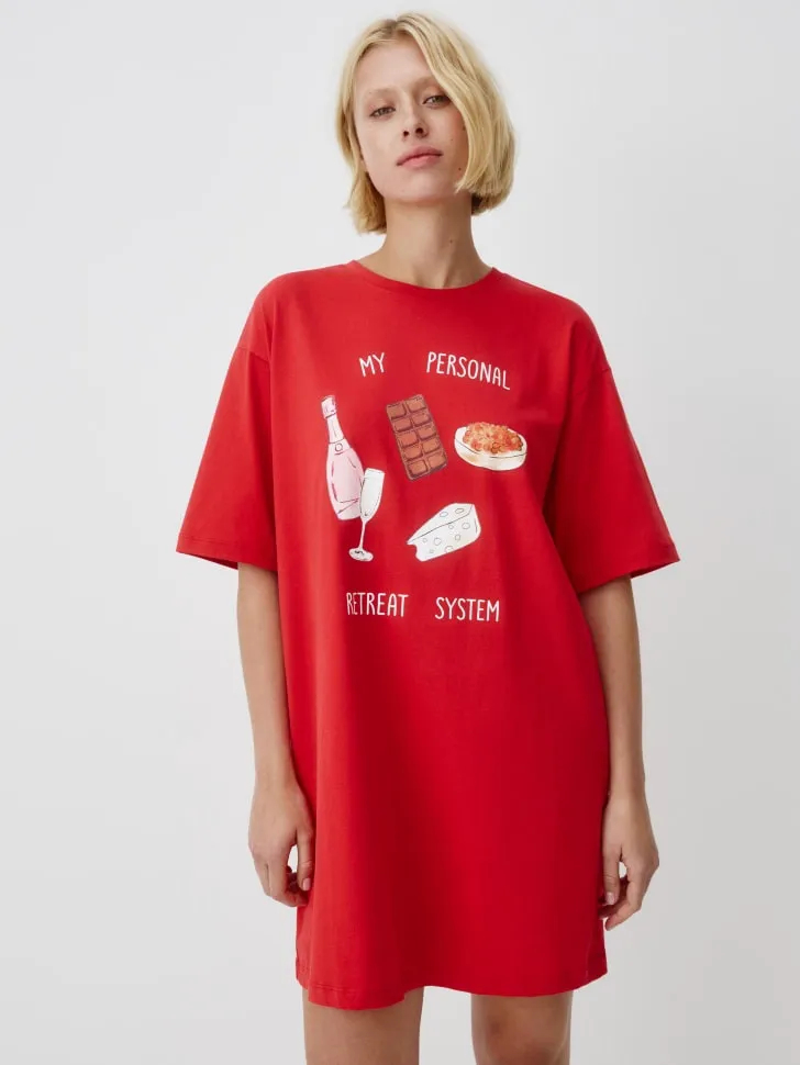 Особое внимание привлекает оригинальный принт, который буквально приглашает к расслаблению и наслаждению: здесь и бутылка вина, и любимый шоколад, и изысканный сыр – настоящий 'personal retreat system'! Это платье станет вашей любимой вещью для домашних посиделок, просмотра фильмов или просто для того, чтобы ощущать себя абсолютно счастливой и расслабленной. Добавьте ярких красок в свой гардероб и позвольте себе насладиться каждым моментом в этом стильном и удобном платье-футболке.