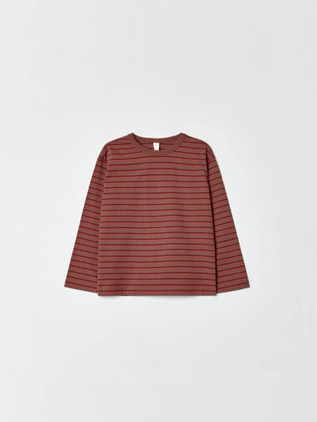Лонгслив выполнен из высококачественного 100% хлопка, что гарантирует мягкость при контакте с нежной детской кожей и отличную воздухопроницаемость. Классический крой и длинные рукава обеспечивают комфорт и тепло в любую погоду, а стильная терракотовая расцветка с темно-красными полосками добавляет образу яркости и современности. Это идеальный вариант для садика, школы, прогулок или домашних игр.