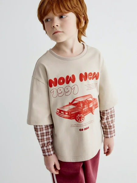 Изготовленный из 100% натурального хлопка, лонгслив обеспечивает максимальный комфорт и приятные ощущения к телу, позволяя коже дышать. Его бежевый основной цвет эффектно дополнен ярким красным принтом с изображением ретро-автомобиля и надписью «NOW NEW 1991», что придает изделию особый шарм и индивидуальность. Дизайн с имитацией многослойности, благодаря клетчатым рукавам, делает эту модель особенно актуальной для демисезонного периода. Лонгслив отлично подходит для активного отдыха, школы или повседневных прогулок. Добавьте его в гардероб вашего мальчика, чтобы он всегда выглядел стильно и чувствовал себя уверенно!