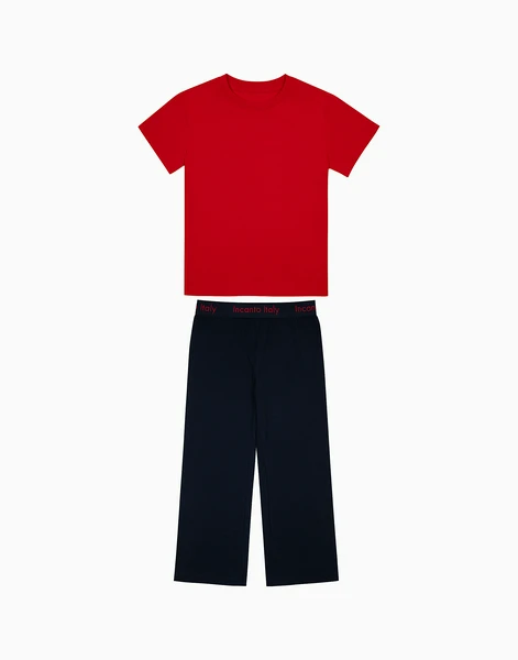 - Цвет: Мультиколор (яркая красная футболка и классические темно-синие брюки)