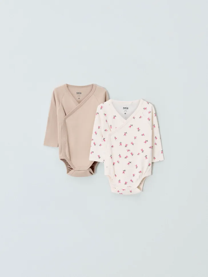 Комплект включает в себя два универсальных дизайна, которые легко сочетаются с другой детской одеждой: одно боди выполнено в стильном бежевом цвете, а второе – в нежном молочном оттенке с милым цветочным принтом, добавляющим очарования. Удобная застежка на кнопки по всей длине и конструкция с запахом делают процесс переодевания максимально быстрым и простым, что особенно ценно для молодых родителей. Продукция Sela – это гарантия качества, безопасности и долговечности для вашего малыша, созданная для ежедневного комфорта.