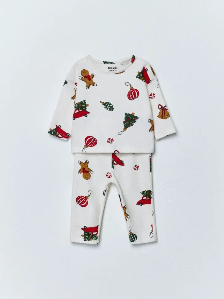 Представляем трикотажную пижаму с праздничным принтом для самых маленьких, которая обеспечит вашему малышу максимальный комфорт и уют во время сна и бодрствования. Этот восхитительный комплект выполнен из мягкого, дышащего трикотажа, который бережно контактирует с нежной кожей, предотвращая раздражения и обеспечивая здоровый микроклимат.
