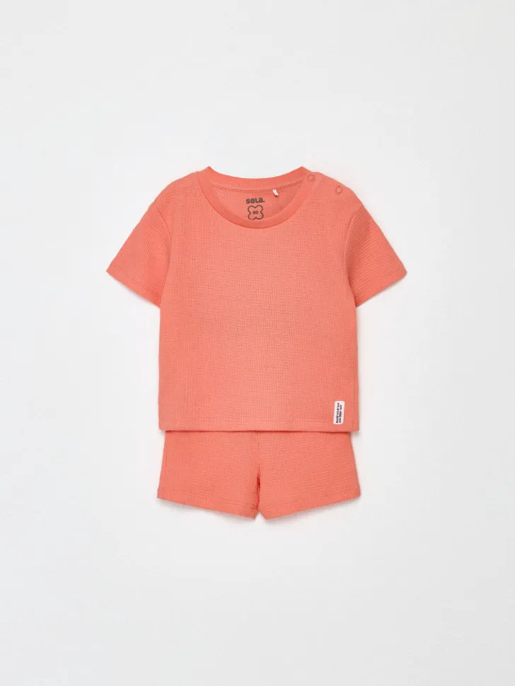 Представляем идеальный комплект для малышей – незаменимый элемент гардероба вашего ребенка, сочетающий в себе стиль, комфорт и практичность. Этот очаровательный набор, состоящий из мягкой футболки и удобных шорт, выполнен в приятном коралловом оттенке, который прекрасно подойдет как для мальчиков, так и для девочек. Созданный специально для нежной детской кожи, комплект обеспечивает максимальный комфорт в течение всего дня.