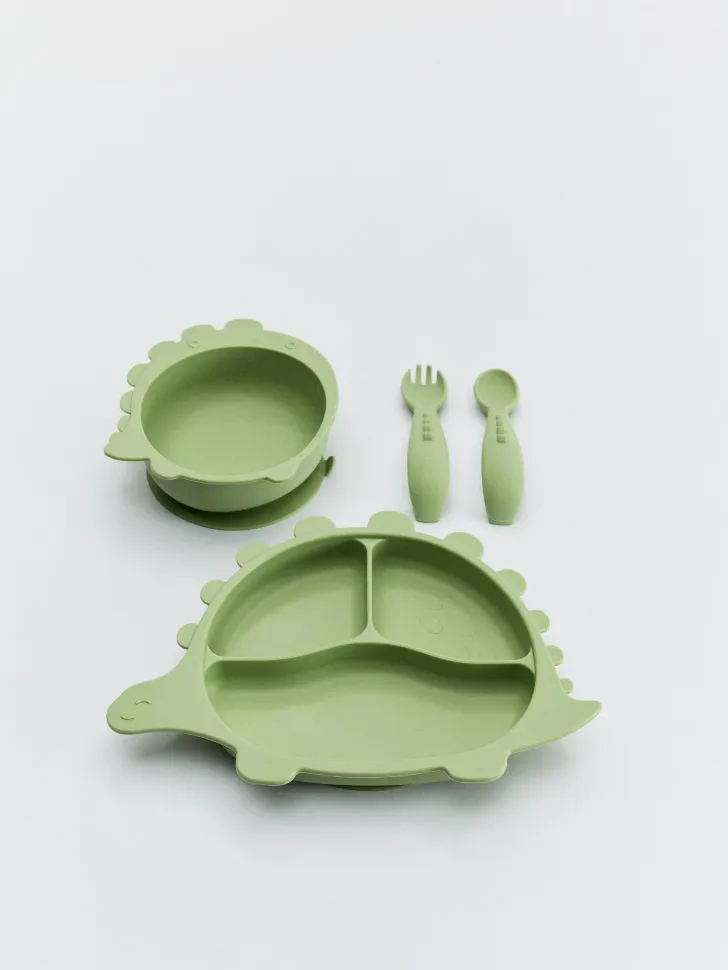 Набор детской силиконовой посуды для кормления, зеленый, арт. art-dinosaur-001