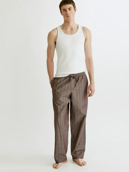 Наши домашние брюки SELA отличаются продуманным дизайном и вниманием к деталям. Свободный крой гарантирует полную свободу движений, а эластичный пояс с регулируемым шнурком позволяет добиться идеальной посадки. Стильный темно-коричневый цвет в тонкую полоску добавит изысканности вашему образу, даже когда вы отдыхаете.