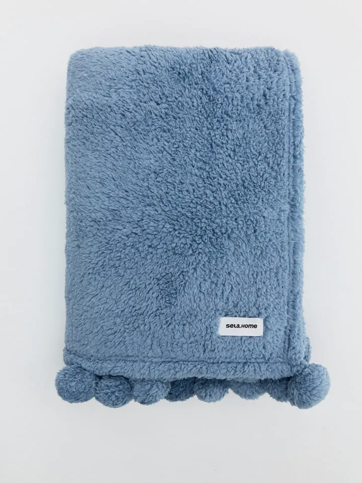 Флисовый плед с помпонами, голубой, арт. б/а