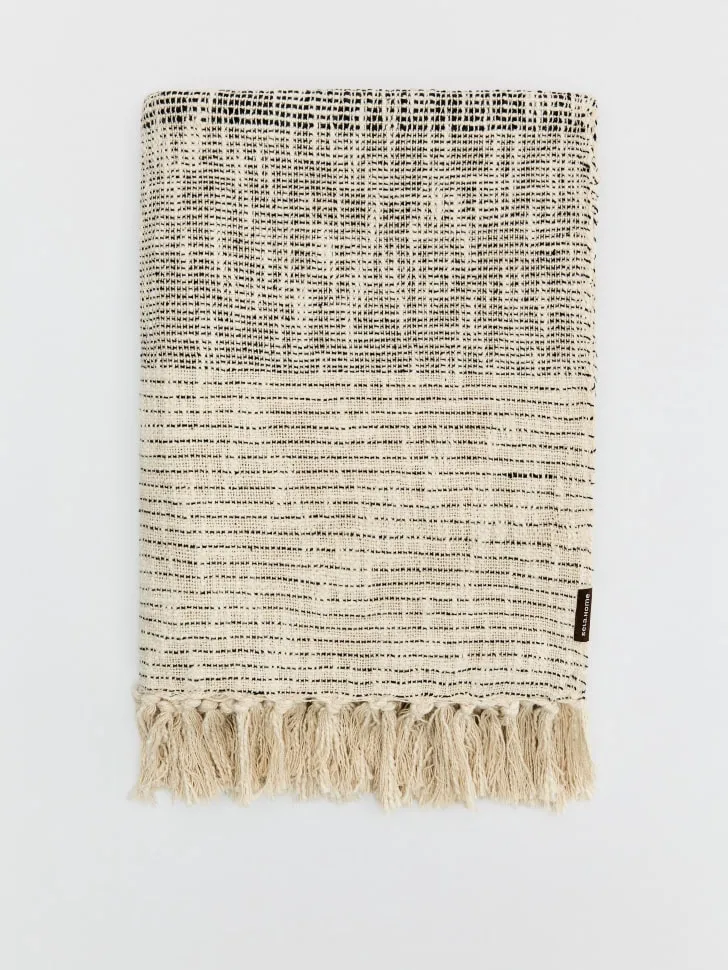 Дизайн пледа воплощает в себе современную эстетику и утонченность. Классическое сочетание бежевых оттенков с изящными черными вкраплениями создает визуально привлекательную текстуру, а оригинальная бахрома по периметру добавляет изделию неповторимого шарма. Этот плед идеально впишется в интерьер вашей гостиной, спальни или рабочего кабинета, став неотъемлемой частью вашего личного пространства. Он прекрасно подойдет для создания уютной зоны отдыха, где можно расслабиться после долгого дня, насладиться тишиной или провести время с близкими. Выберите наш плед, чтобы ваш дом стал воплощением комфорта и стиля!