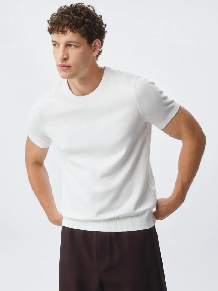 Универсальный крой прекрасно подойдет для создания разнообразных образов: от повседневного кэжуал-стиля с джинсами или шортами до более элегантного, если скомбинировать ее с юбкой или брюками. Добавьте к ней любимые аксессуары, и ваш неповторимый образ готов! Эта футболка станет незаменимой вещью в вашем гардеробе благодаря своей практичности и эстетичности. Она легко стирается, сохраняет форму и цвет после многократных стирок, что гарантирует долгий срок службы. Выбирайте нашу вязаную футболку, чтобы добавить немного уюта и стиля в ваш повседневный гардероб. Обновите свой летний образ с нашей новой коллекцией и наслаждайтесь каждым моментом в комфорте и стиле!