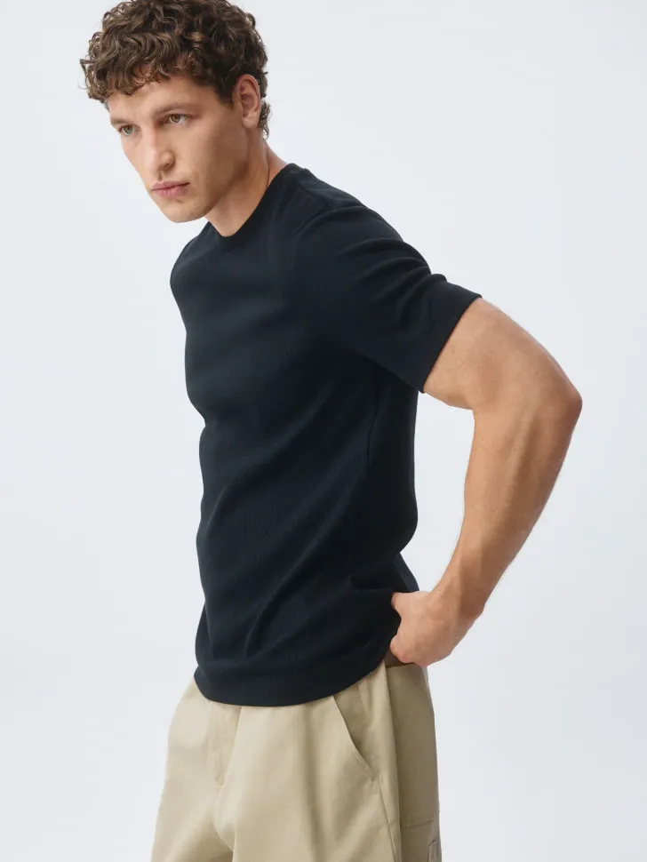 Эта модель отличается универсальностью: она станет прекрасным дополнением как к повседневному стилю, так и к более официальным или вечерним нарядам. Сочетайте ее с любимыми джинсами для расслабленного образа, или добавьте классический пиджак и юбку для деловой встречи. Футболка в рубчик легко интегрируется в многослойные комплекты, выступая как идеальный базовый слой. Высокая износостойкость и простота в уходе обеспечивают, что изделие сохранит свой первозданный вид даже после многократных стирок, оставаясь ярким элементом вашего гардероба на долгие годы. Откройте для себя комфорт и элегантность с нашей приталенной футболкой в рубчик — ваш идеальный выбор для каждого дня!