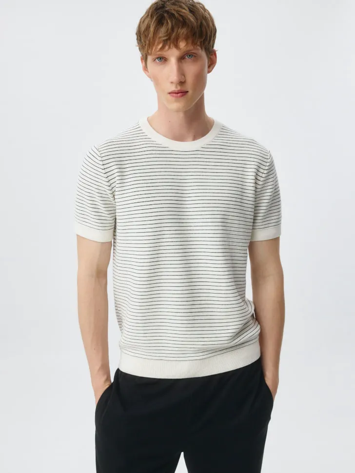 Представляем идеальную вязаную футболку в полоску – настоящий must-have этого сезона! Эта модель сочетает в себе невероятный комфорт и актуальный дизайн, который никогда не выходит из моды. Изготовленная из легкой и приятной к телу пряжи, она подарит вам ощущение свободы и свежести даже в самый жаркий день. Классический полосатый принт легко вписывается в любой гардероб: носите ее с джинсами для повседневного образа или с легкой юбкой для более романтичного стиля. Добавьте немного морского настроения в ваш лук!